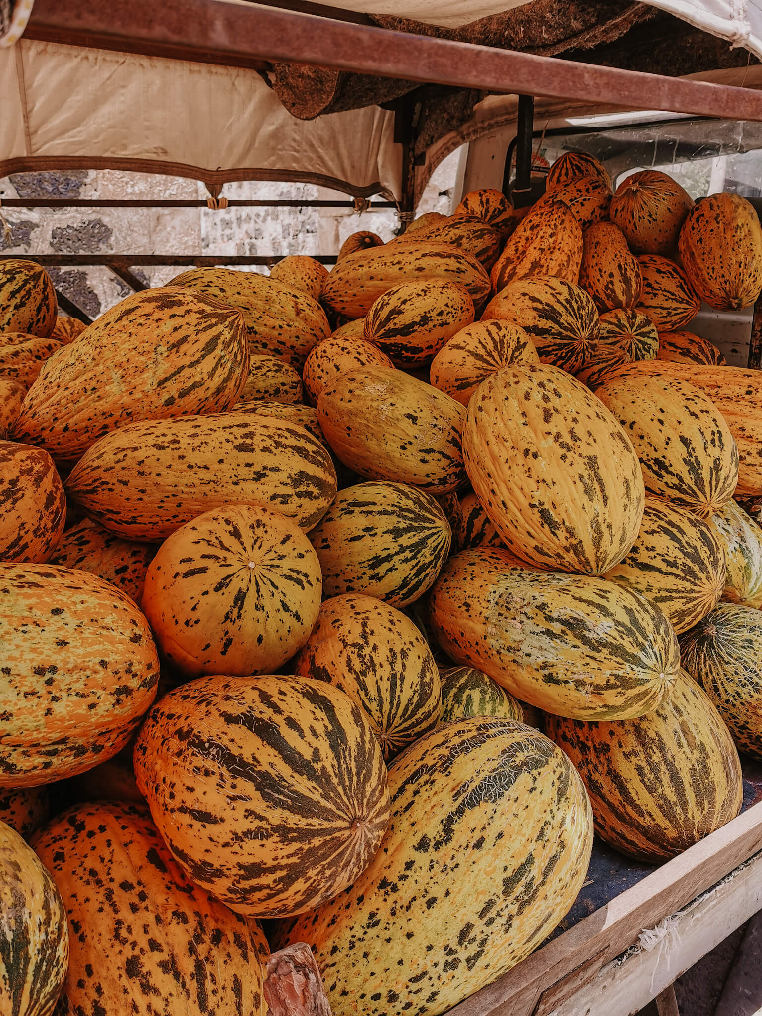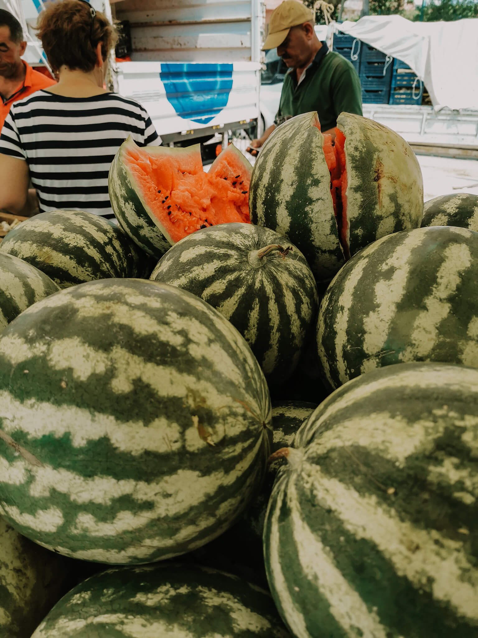 Was auf jeden Fall nicht gespritzt wird, sind die Melonen, die in der Region wirklich wie Unkraut wachsen und jede*r im Garten stehen hat. Die Laster voller platzreifer Wassermelonen, wie habe ich sie vermisst!