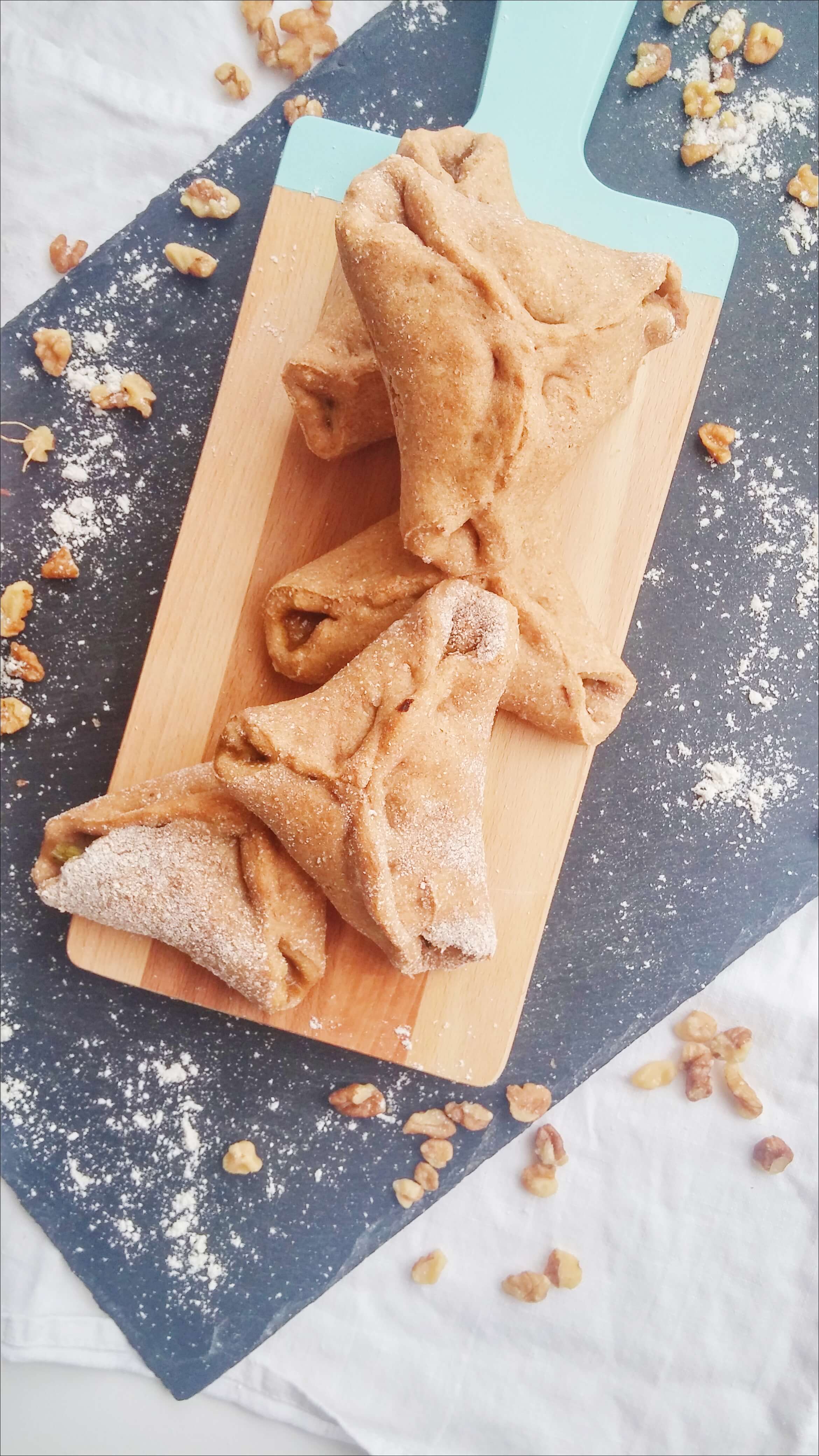 - Knetet den Teig noch einmal ganz kurz durch, bis er geschmeidig geworden ist und rollt ihn auf einer bemehlten (!) Unterlage etwa 5mm dick aus. Rollt auf keinen Fall dünner – sonst halten die Taschen nicht richtig zusammen und fallen wieder auseinander!