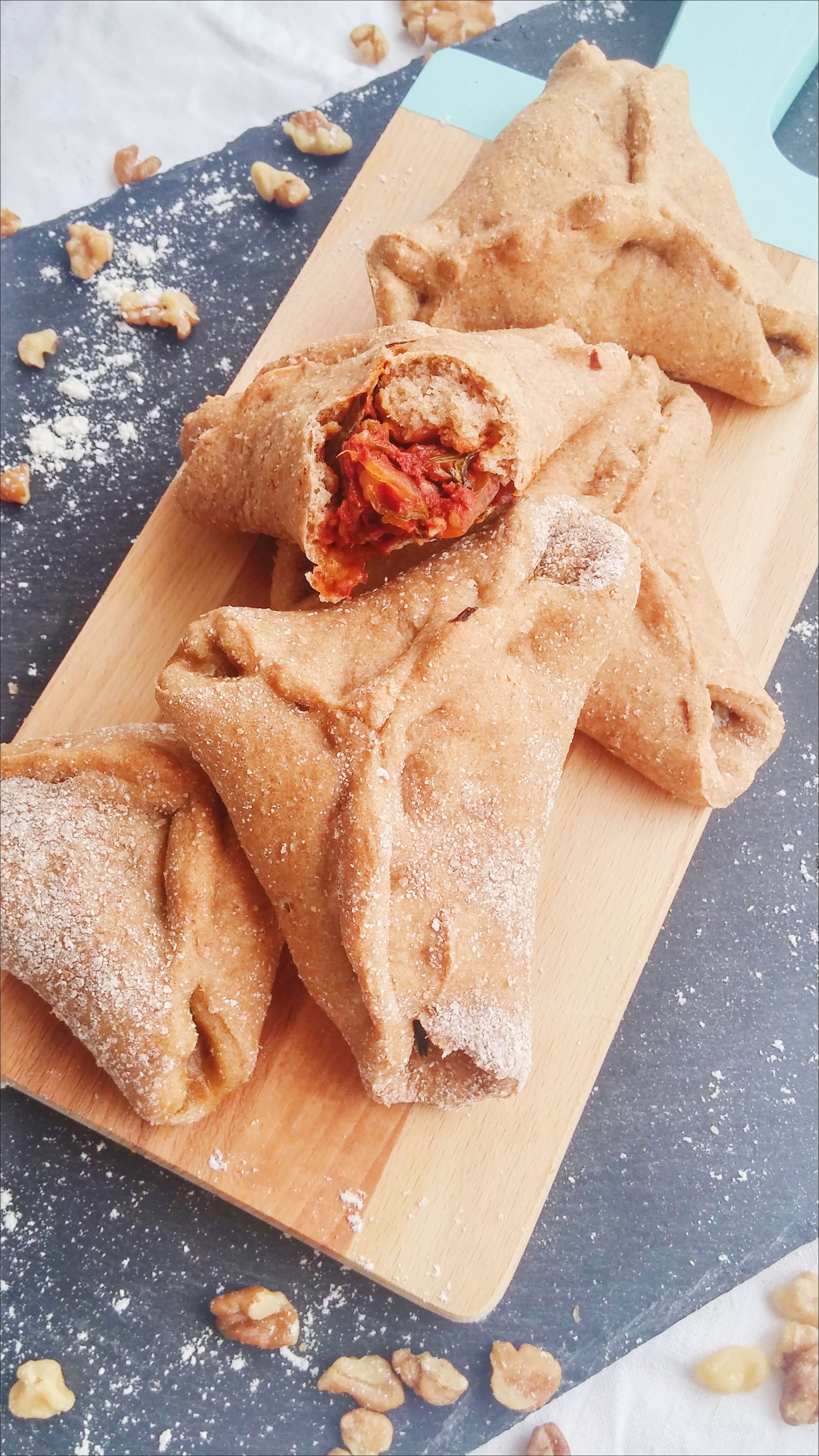 Und wir denken uns immer wieder neue Arten aus und suchen immer wieder nach neuen Möglichkeiten, die Täschchen mit Leckereien zu füllen. Das folgende Rezept enthält einmal den Grundteig, der an den orientalischen Basis-Teig des Fladenbrotes angelehnt, aber vollwertiger gestaltet ist und anschließend zwei Möglichkeiten, die Teigtaschen zu füllen – eine Füllung basiert auf Spinat und ist sommerlich-frisch, die andere hat Tomatenmark als Grundlage und ist etwas herzhafter im Geschmack. Je nachdem, was ihr lieber mögt, könnt ihr euch eine der beiden Füllungen aussuchen – oder wahlweise auch beide ausprobieren. Oder – ganz innotativ! – ihr füllt die Teigtaschen jeweils mit beiden Füllungen, sodass ihr eine neue Kombination erschafft. Das bleibt ganz euch und eurer Kreativität überlassen.