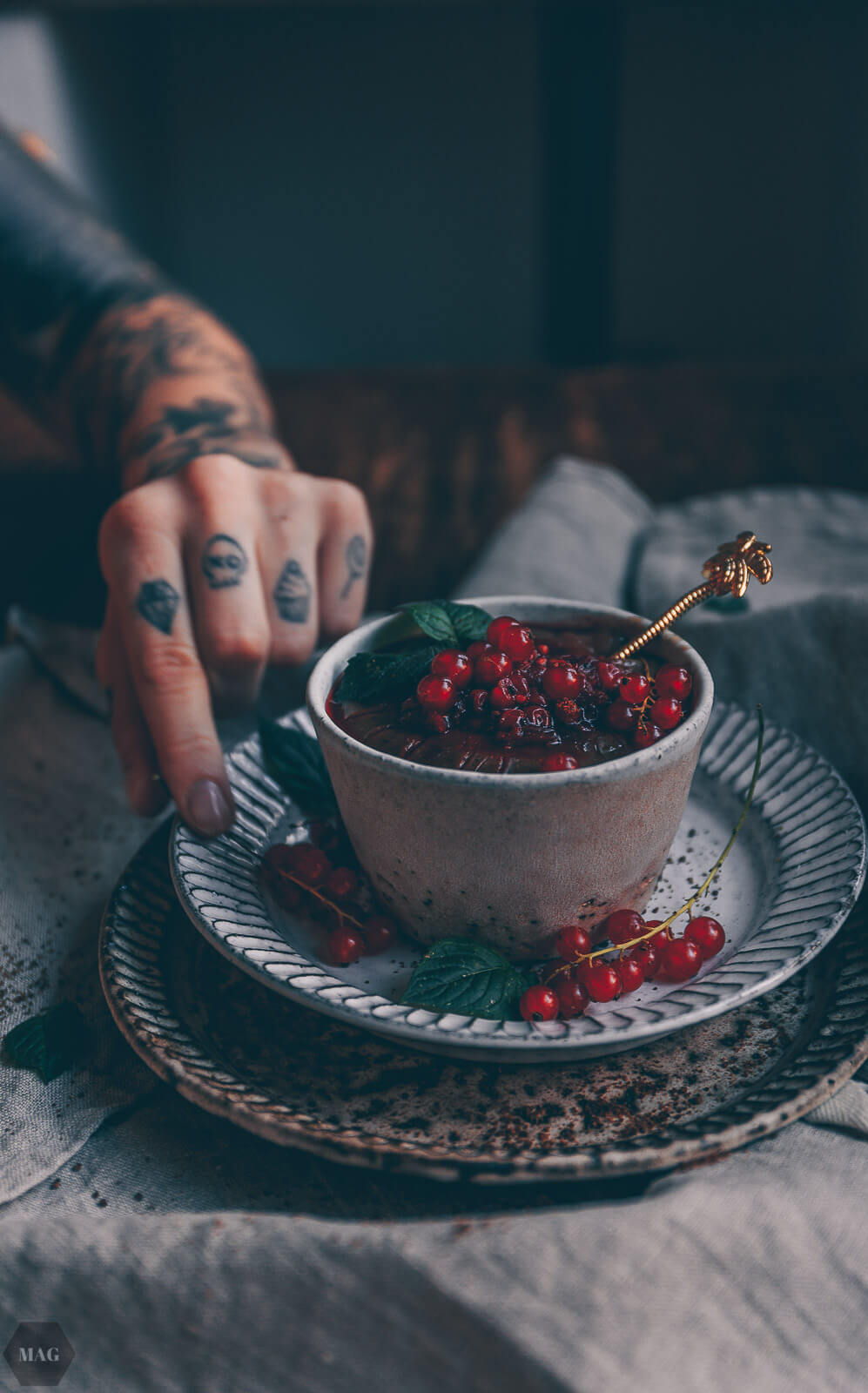 - Nun könnt ihr schon servieren – rührt den Vanillepudding noch einmal kurz um, falls er angefangen haben sollte, zu erkalten, und füllt ihn in kleine Schälchen. Toppt ihn mit der Johannisbeer-Soße und nach Bedarf mit ein paar frischen Johannisbeeren und einigen Blättern Minze.